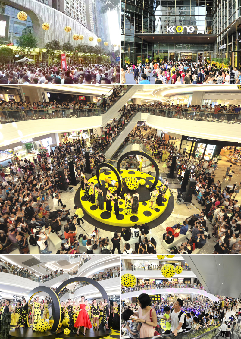 开业当天,KK ONE始终人潮涌动,顾客络绎不绝,200多家潮流品牌联动全城钜惠,餐饮5折,海量潮礼,更有精彩纷呈的潮流盛典如创意波点服饰设计大赛颁奖典礼、豆豆家族主题展、遇见波点之MINI车展、怡泉+C时尚派对、波点艺术展、创意橱窗等酷炫活动与消费者进行互动。